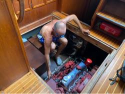 Мы думали, в переходе сваять еще пару-тройку фильмов, но опреснитель съедает электричества на 25 литров пресной воды в час, а выдает всего 12. На зарядку ноутбуков энергии почти не остается. Вчера завели мотор для заряда батарей, и в фильтре допнула заглушка, соляра полилась в трюм на молниеносно подложенный памперс («хозяйке-на-заметку»). В итоге сегодня полдня капитан провел в трюме. Ну, +32 еще ведь не предел температур, так что все ок.