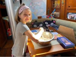 Дневное время разбавляем романтическими прогулками на палубу, подправить паруса и солнечные панели, погрызть семечек или почитать под солнцем минут 15, чтобы кожа привыкла. Вчера завели тесто и напекли пирожков с яблоками, прямо пиршество вышло. Ветер прикинулся пассатом и с неделю стабильно дул с востока. Однако, уже перестал, поменяется на северный, и снова будем идти не туда. Капитан грозится закинуть удочку, чтобы навялить еще рыбы, пока эта не кончилась, а мы его дружно отговариваем: — Давай выдохнем несколько дней, а то я только что кастрюлю от ухи отмыла. Пойманный недавно крупный тунец отказался таким жирным, что после ухи жир на стенках кастрюли буквально пластинизировался. Не брало его ни фэйри, ни сода, помогло только кипячение с содой, и то не сразу. Следующую уху будем из мяса варить, не из головы, видимо.