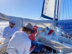 На самом деле, праздник удался: удовлетворение от алых метровых заплат, нашитых с двух сторон на главный парус (парусина кончилась, в ход пошли цветные мешки для парусов. Если так пойдет и дальше, нам будут завидовать мастера пэчворка) даже перебило чувство усталости. Ура! — капитан сжалился, дыры временно кончились, и мы успели выпить безалкогольного шампанского на палубе. Последняя, не в пример предыдущим 30-ти дням, не уходила из-под ног и не заливалась морем. Даже словили ту самую романтику морского круиза, о которой все говорят, но в дальнобоях мы ее почти не видим :)). Потому что идем либо по «ревущим» широтам, либо остро к свежему ветру, а это скорее круглосуточный труд, чем отдых. И вот погодное окно: пришел абсолютно попутный слабый ветер, и впервые за месяц мы поменяли галс. На прежнем яхту стало нести в сторону Аляски (вы удивитесь, но с совсем попутным ветром яхта идти не может). После смены галса мы поползли в сторону Марианских островов, на юго-запад вместо северо-запада. Именинница приуныла пуще прежнего (а ведь месяц и так не был веселым). «Срочно ищи плюсы»- трепыхнулся голос в голове. А вот и они: как ни крути, а изменение ветра уменьшило волну и дало нам небывалую возможность открыть люки и починить парус.