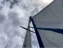 Фал генуи, самого большое переднего паруса, лопнул беззвучно. Неотличимо от волны, вдарившей в нос. Кэп глянул на приборы, скорость упала втрое. Через пару секунд с палубы раздалось: — Включайте палубный свет. Аврал. — Мама, а генуи нет! Настя взглянула в окно рубки. И правда, нет. И мы выскочили в ночь. Фал лопнул в месте входа в топ мачты. Падая, парус вышел из ликпаза и теперь держался только в верхней и нижней точках крепления, сдвинутых вместе на бушприте. Полотнище покоилось в океане, изображая гигантский черпак, заполненный водой. — Марина, на штурвал. Настя на бушприт. капитан командует от мачты. Лада, фонарик! Пассатижи! Изоленту! Скальпель. Нить. Спирт. Огурец Вкоре я ухожу от штурвала к бушприту. Андрей заводит временный фал. Мы с Настей отвоевываем у моря и ветра тяжелого жесткое полотнище. Впихиваем по сантиметру в тонкий липаз, благодаря небо, что это случилось не в шторм. Парус временно встал на место. Костяшки пальцев, конечно, ободрали, но это мелочи. Половина следующего дня (как раз та, на которую пришлась жара при полном безветрии) прошла у капитана на мачте, у остальных внизу, за кручением лебедок, подаванием шурупов и изолент. Юнга принимала в работах деятельное участие. Только мы подумали о купании после работ, как на горизонте материализовалась черная дождевая туча. Ветер свистнул: все со мной! — и мы помчались остро к ветру, чтобы не упустить дождь. Лило часа два. Собирали воду и мылись под дождем, пока не замерзли. Лада ушла греться, заявив напоследок: — Пойду суп варить, а то ведь вы вернетесь голодные. Рисово-овощной суп смели за один присест, и все попросили добавки.