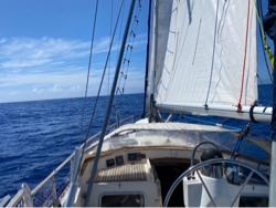 Вчера наш новый дорогой и высококачественный термос, купленный на Тасмании взамен убиенному за год, перестал держать тепло. Причем, ни разу не падал, и всю дорогу был помещен почти к богу запазуху: капитан специально модифицировал диван, чтобы термос вставлялся удобно, глубоко и мягко между стенкой и диванной подушкой. Вот думаю, написать им, а вдруг новый пришлют )). Хороший термос важная вещь в дальнем плавании, позволяет экономить газ. Снова оценили прелести вморду-ветра. Два дня погода к тому же еще и заливала дождями. Последнее оказалось нам на руку, несмотря на духоту в закупоренной лодке. Что-то серьезное случилось с опреснителем, и экипаж перешел на жесткую экономию воды. Капитан снова установил к гику устройство, которое он ласково зовет клизьма. Дождевая вода стекает по парусу на гик, оттуда в широкую воронку, соединенную шлангом с ведром. Промокший до нитки Андрей так открыл банно-тропический сезон. А мы с девочками благодаря этому водосбору сегодня тоже его открыли мылись на палубе из нагретых солнцем бутылок с дождевой водой. Список поломок, которые необходимо устранять где-то в середине океана все увеличивается. Капитан хмур, хоть мы и стараемся его бодрить: — Прорвемся. Атлантику шли на дождевой воде, и сейчас наберем. Все будет хорошо. Список поломок, которые необходимо устранять где-то в середине океана все увеличивается. Беда в том, что, кажется, в опреснителе сломалась самая дорогая деталь то ли мембрана, то ли вся мембранная помпа. Наш заход к местам с запчастями и повышенная там активность на тему ремонтов по-прежнему эфемерны. Закрытые на пандемию страны никуда не делись. Зато анти-жарищные шторки работают хорошо, а зашивание грот-паруса перед баней, да на залитой солнцем крыше рубки, да на волнах с барашками здорово поднимает настроение: вот сколько событий за день! Только бы опять не пришлось ночью у штурвала сидеть. Ветер порывистый, и лодка сбивается с курса. Подруливаем по очереди. А вчера ночью вообще гроза налетела! Зевс метал молнии, норовя попасть в единственную на сотни миль торчащую металлическую палку. Даже две палки у нас же две мачты. Мы обесточили лодку, задраили люки и отруливали шквалы, благо, внутренний штурвал деревянный. Но вроде обошлось, громоотводом мачта так и не стала.