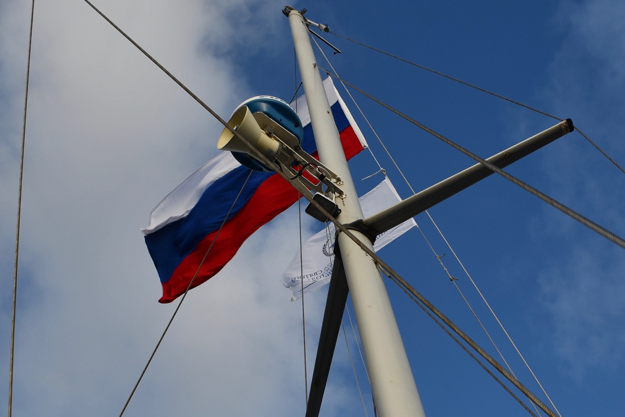 Наш российский стяг развевается над флагом Географической школы, на алой полосе зияет пробоина предательский след ванты у мыса Горн.