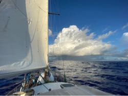 Какая досада, как говорила Фрекен Бок. И больше всего мне жалко холостого хода 2 дня на север, и потом 2 дня на юг для возвращения на трек. Потеря дней, миль и пустые галсы не туда деморализуют меня больше всего. Я готова долго терпеть и даже помучаться, зная, что мучение ведет к цели. А вот потерпеть просто так увольте. Да, видно, это моя точка роста :). Леди Мэри выползла на второй с половиной градус севернее экватора, в надежде, что мощная река экваториального течения хоть немного ослабнет. Течение сносит нас на восток со скоростью два узла, обнуляя попытки идти на северо-восток остро к ветру. Экваториальная океанская река выигрывает со счетом 5:0. Шансов попасть на остров Киритимати (он же остров Рождества) под парусом ноль. А к земле надо бы. Несколько дней назад Андрей написал агенту на атолле, и вот наконец пришел ответ, что нам могут позволить встать на якорь, починиться и пополнить запас воды и фруктов, так как мы попадаем под кейс по emergency. — Андрюша, а если мы эти 50 миль помоторим? После раздумий капитан соглашается завести мотор, несмотря на подозрения о текущей трансмиссии. Но скорость первого получаса 1,8 узлов. Ну, то есть, сутки моторить и не факт, что дойдем. Только мы подумали забить на остров Рождества и прорываться к Таити (что не очень реально из-за того же течения), как скорость увеличилась до 3х миль в час, и мы смирились с закрытыми окнами, скачками против волны и ветра в обмен на стоянку у острова. Если вы смотрели последний день наш трек на вкладке маршрут, то наверняка недоумевали, куда мы устремились ). Не на Гаваи, нет. Просто нас проносило мимо земли.