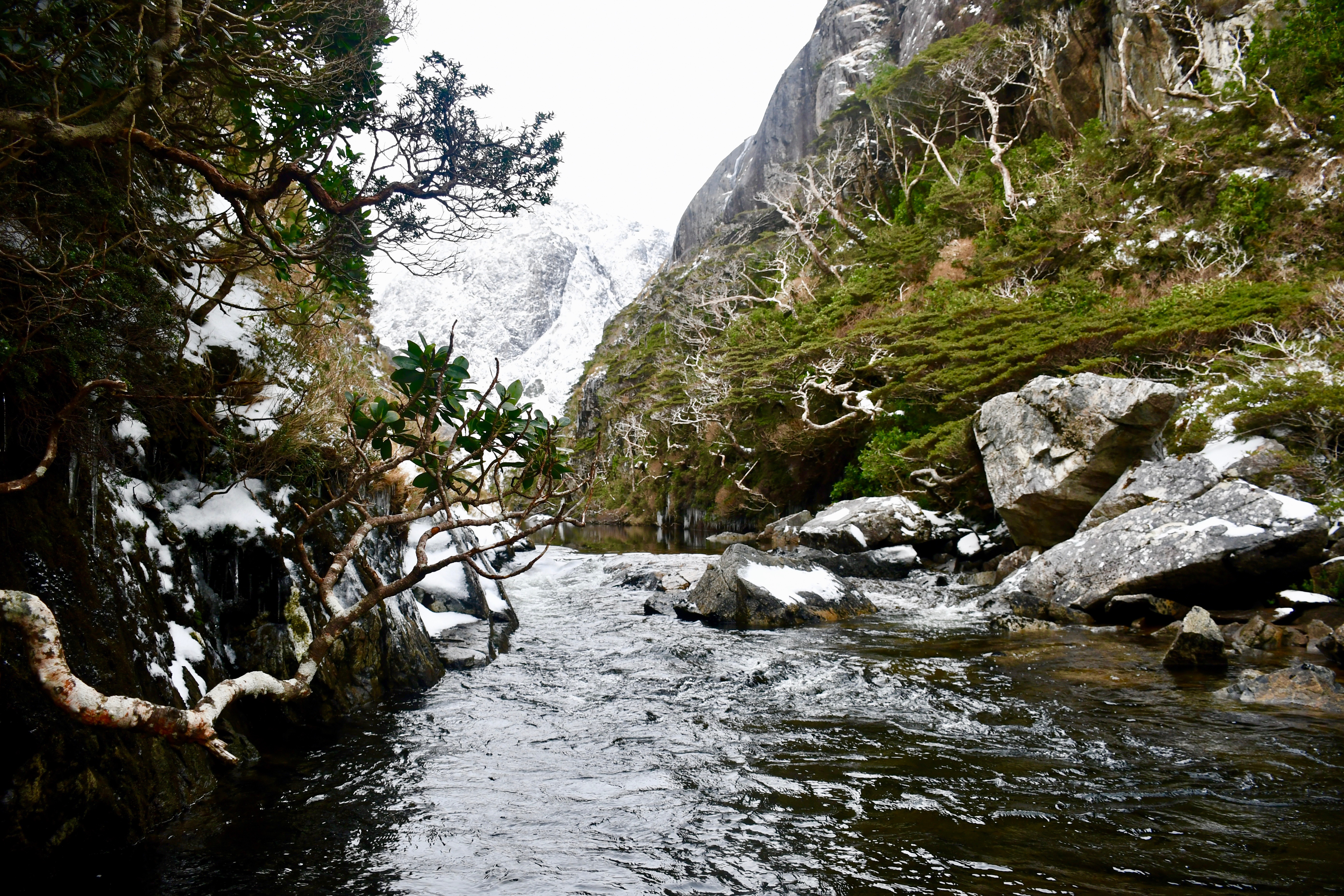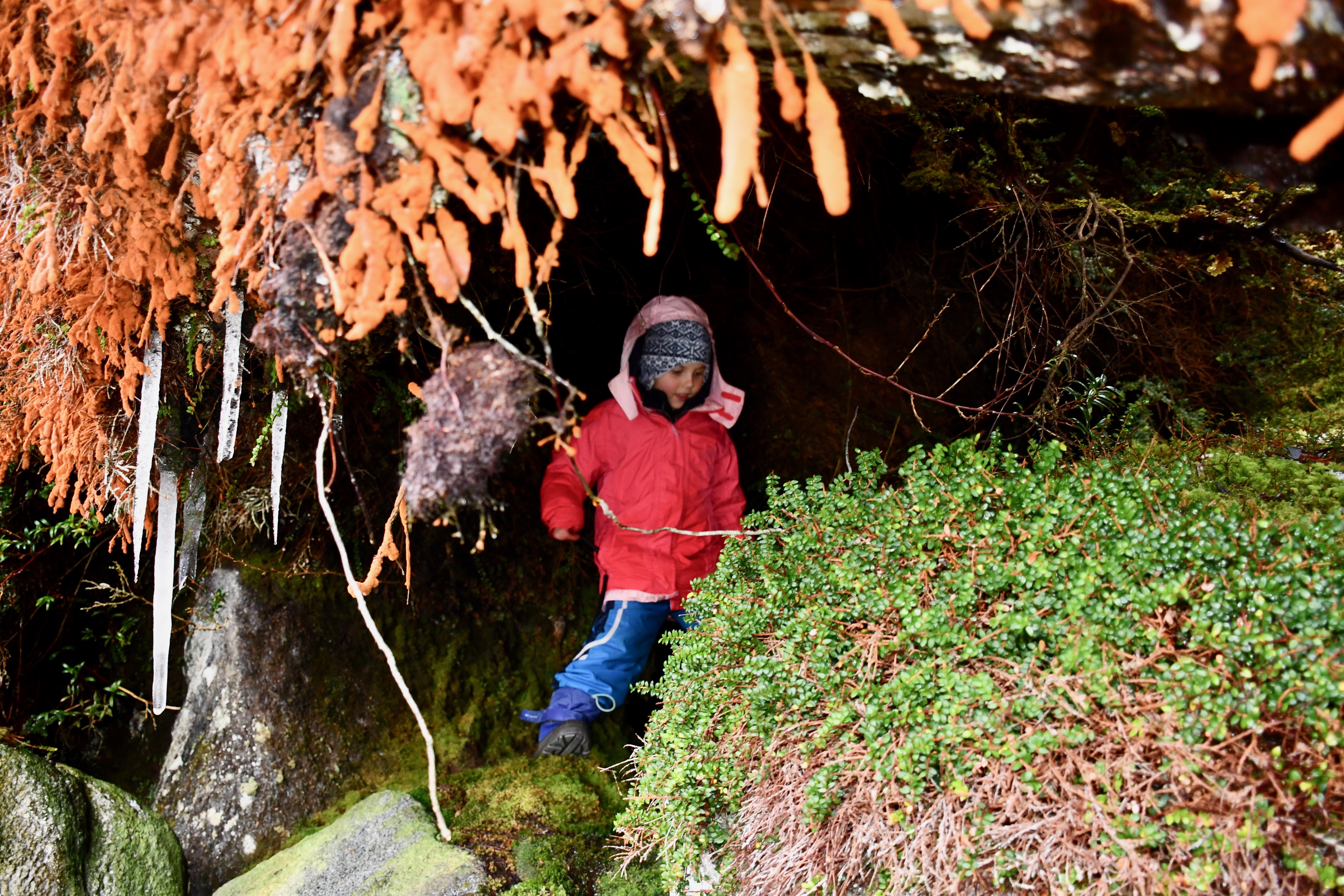 Зато перед закатом солнышко пару раз просияло от радости, увидев нас, и красота была зачтена. Я даже догребла до ручья с очередным оочень маленьким водопадиком. Нашла возле него пещеру под корнями старого дерева, изгибов и ковров стелющихся растений. Пол устлан мягким мхом, на входе сосульки до земли, а арка оторочена неведомым нашей корабельной науке оранжевым мхом, что стелется по поверхности сухих травинок и веточек.