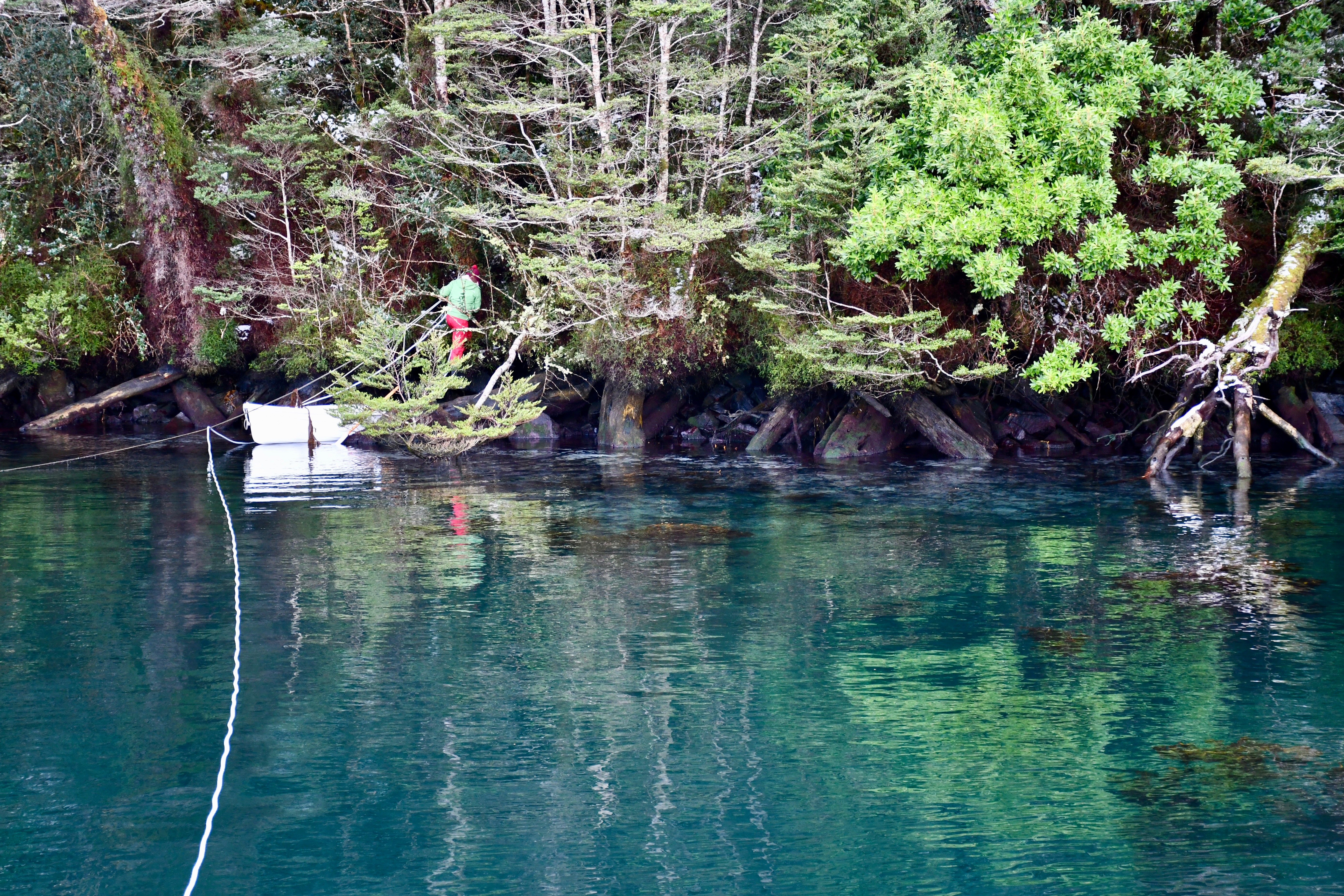 В самом конце фьорда налево симпатичный закуток. Следы присутствия людей спускаются в воду плавучими веревками. Одна из них настолько длинная, что сначала мы привязались кормой прямо к ней, а не к нашему канату. Но после поменяли веревку, чужой канат не проходил в клюз, а так просто оставлять его капитан не хотел, об крепеж солнечной панели трется. Мы с Ладуней после привязки собрались в поход. Со скалистых стен гирляндами висят и стоят сосульки, некоторые сантиметров 70.