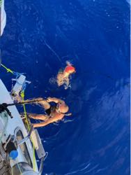 Не, в Западной Австралии мы, конечно, купались, но на стоянках. А вот с лодки и на ходу почти 3 года назад. Потом ушли в холодные воды, и ни разу не было той жары, от которой хочется занырнуть в океан на веревке за яхтой. Жара совпала со штилем, на длинный канат привязали кранец (такие продолговатые надувные штуки, которые впихиваются между бортом и причалом). Пловцы надели маски, Андрей взял скребок, и оба плюхнулись в воду. Ладуня резвилась, ныряла и стояла на веревке. Когда яхта имеет ход, так не поплаваешь. Пловцы залезают в альпинистскую обвязку, прикрепленную карабином к канату, и мчат за яхтой, как водный лыжник, который свалился. Капитан немного почистил корпус, и на отставшие от днища водоросли приплыли три полосатых рыбки. Старпом во время купания выполняла важную задачу: с кормы наблюдала, чтобы за рыбками не пришли акулы, и не съели полкоманды. Не съели, жизнь удалась. Она вообще удалась, когда мы вошли в теплынь.