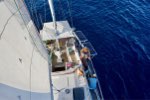Тянем-потянем, вытянуть не можем Как мы марлина ловили. Переход по Тихому океану на остров Пасхи. День 17-18. Сказка о репке по-Хэмингуэевски. ~~~~~ _/) ~~~~~ _/) ~~~~~ _/) ~~~~~ _/) ~~~~~ _/) ~~~~~ _/) ~~~~~ _/) ~~~~~ _/) ~~~~~ _/) ~~~~~ _/) ~~~~~ _/) ~~~~~ _/) ~~~~~ _/) ~~~~~ _/) ~~~~~ Палуба Леди Мэри являет собой трагикомичную картину: Настя носится по палубе, жонглируя камерой, веревкой и крюком, капитан натужно крутит катушку удочки. Упомянутая с треском разматывается сквозь закрытый стопор. Старпом растягивается в проходе, ударившись спиной, ноги летят под бортовые ограждения. Холодный ветер свищет прямо в нос, яхта скачет по трехметровым волнам. Юнга в трусах пытается удержаться у входного люка, размахивая початой бутылкой рома. Второй час активной рыбалки. Кэп ободрал руки, успел повисеть в альпинистской обвязке за кормой. Старпом рассадила спину и ноги. Ветроруль беспомощно болтает оторванным тросиком. И мы гадаем, что лучше: победить и после думать, куда девать 40 кг мяса, или дать уйти огромному марлину. Сегодня мы пересекли тропик Козерога. Может, после него и начинается зона океанских гигантов? С утра был толстенький тунчик. Хватило на жарку, уху и сашими. К обеду навигатор отмерил 23 градуса южной широты, и затрещала удочка. Укачанные на встречном ветре и высокой волне, женская часть экипажа возрадовалась весьма сдержанно. Детям рыба надоела, а старпому надоела качка какая тут рыба. Между тем мы снимаем геную, затем стаксель, а рыбина упорно тянет назад. Андрюха облачился в удочко-держатель и велел готовить крюк. В волнах показалось беловатое тело крупной (метр двадцать) махи-махи. Сантиметров на 15 больше Ладуськи. А Ладуську, мне кажется, удочкой фиг вытянешь Притянув рыбину к борту, кэп передал мне удочку, а сам прицелился крюком в большую туполобую голову. Но что-то пошло не так. Крюк скользнул и зацепился за жабру. Рыбина дернулась, вырвав орудие из рук. Кэп схватил леску, которая вдруг легко провисла между пальцами. Чудище скрылось в пучине вод с нашей второй по уловистости наживкой на губе. Утопший крюк оказался плавучим и машет экипажу черной ручкой на прощание. Маневр Человек за бортом, точнее, не человек, а крюк. Я перстом указующим тычу в направлении крюко-ручки, Настя заводит двигатель и достает сачок, Ладуська благоразумно смылась в рубку, а кэп за штурвал. Поймать сачком полутораметровую палку, вертикально стоящую в воде, предстояло Насте. У меня самая сложная работа: держать удочку и указующий перст на утопшем орудии. Со второй попытки Леди Мэри удалось бочком наехать на него, кэп оставил штурвал и поспешил к матросу, которая начала операцию перехват — слезла на борт, чтобы зацепить крюк ногой. Я, наконец, пристроила удочку и метнулась в гущу событий, чтобы успеть поймать дочь хотя бы за косу. Каким-то чудом крюк был спасен, никто из экипажа не утоплен, и мы, оплакивая очередную наживку, по-быстрому снабдили крюк веревкой-держателем. Часы намекали на ужин, а тошнотность на то, что ужина не будет. Из-за холодины на этом самом тропике Козерога решили мыться не на борту, а в кокпите. Лада уже получила свою порцию вечернего душа. Старпом, жмурясь на оранжевое солнце, притащила себе воды и махровое полотенце Ничто не предвещало беды, как вдруг завизжала леска. — Трави геную! Иди на бак, снимаем стаксель! полетели команды капитана. Матерясь про себя (прости, господи), трясусь от холода у ста
