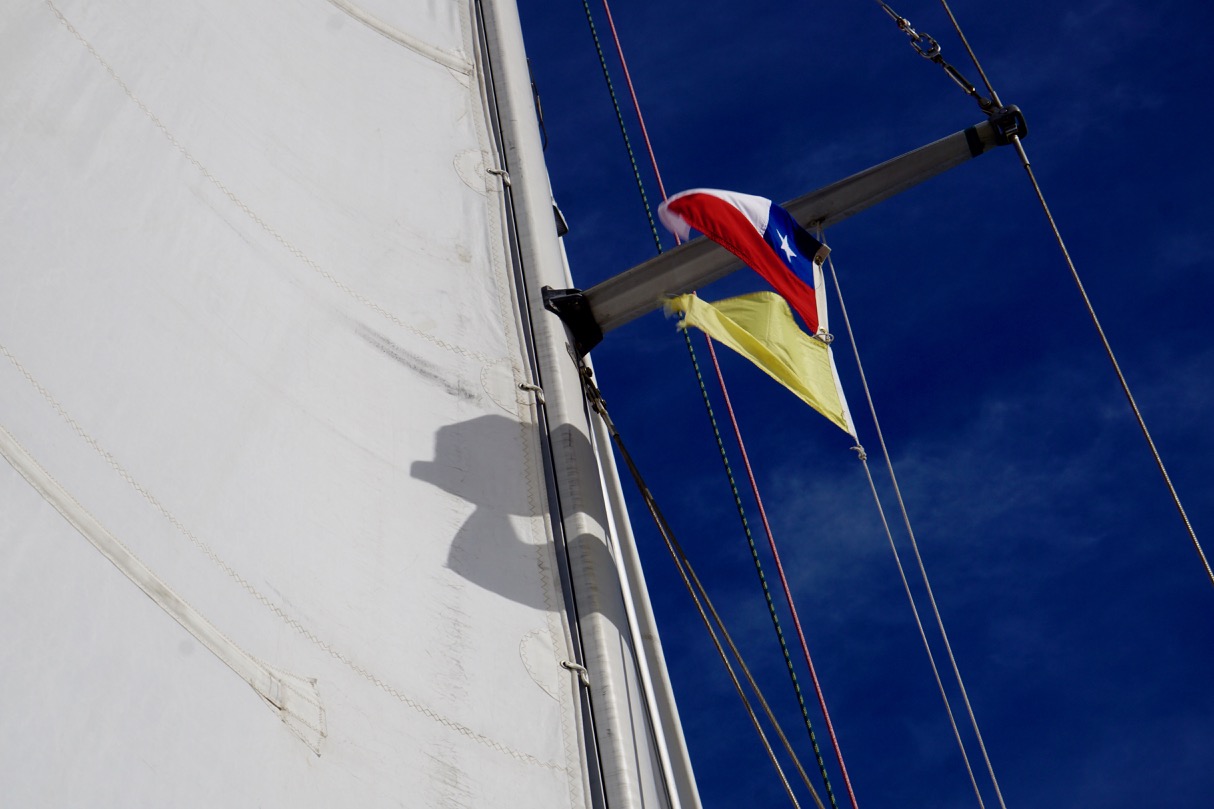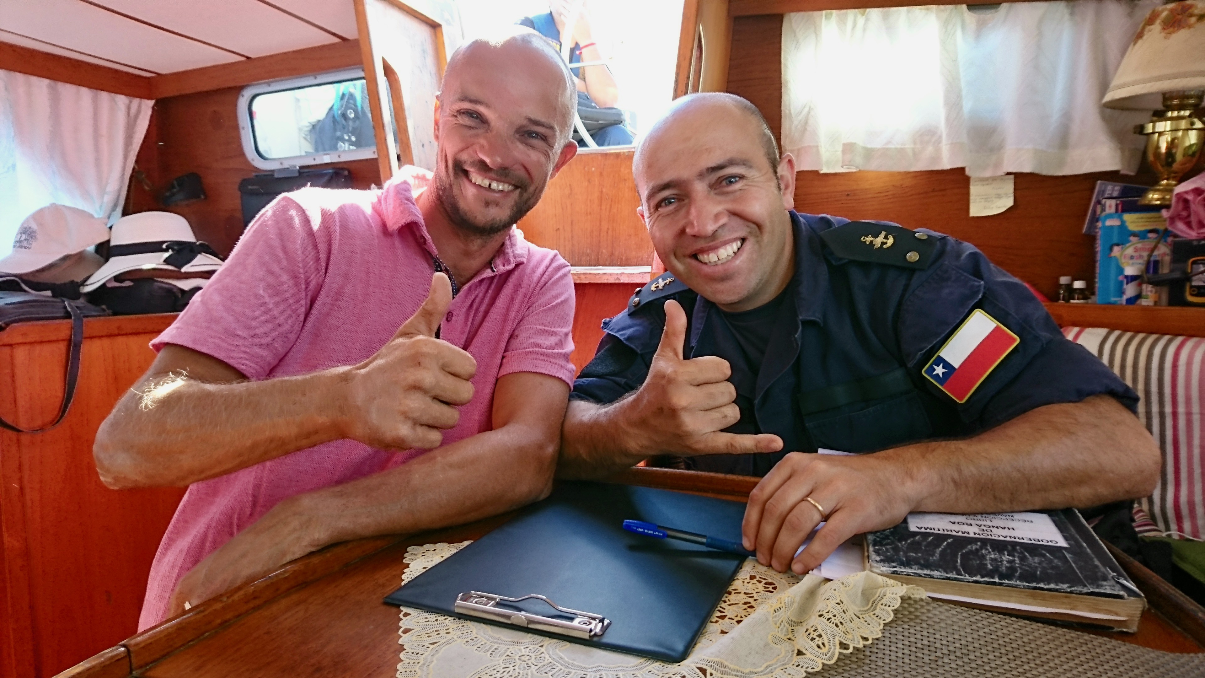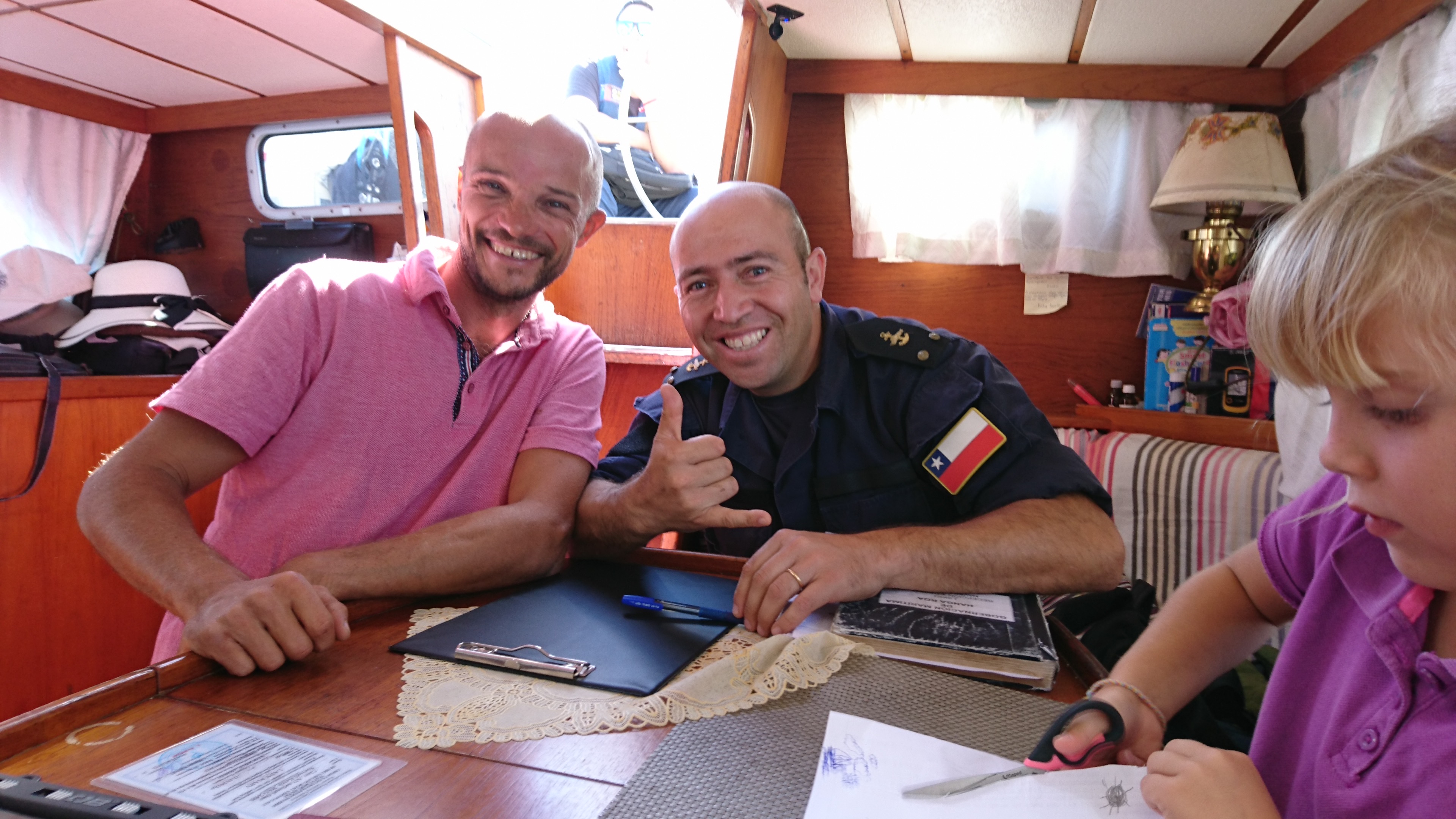Делегация из шести человек плюс два рулевых с надписью «Армада» на спине, офицер вооруженных сил Чили – Маурисио – тот самый, кто двое суток окружал нас почетом через рацию. Еще молодой доктор Фабрицио, ветеринар, агроном, таможенник и имигрейшен. Все уселись в кокпите. Маурисио зашел в рубку, потом сюда же подтянулся Фабрицио. После заглядывала девушка ветеринар. Или агроном. Остальные так и принимали солнечные ванны.